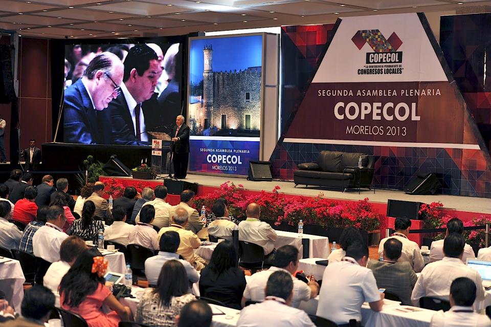 Desde esa plenaria, se analizó lo relativo a los proyectos de Mando Único Policial y Prevención del Delito. En su mensaje, el Gobernador Graco Ramírez Garrido informó a los diputados de los congresos del país que en la Conferencia Nacional de Gobernadores (CONAGO) se trabaja para que los estados tengan finanzas sanas con rendición de cuentas, por lo que dijo a los diputados les corresponde legislar para que todos los servidores públicos se sometan al escrutinio de la transparencia. El diputado Juan Ángel Flores Bustamante, integrante del comité organizador de la reunión de la COPECOL, destacó el sano intercambio entre legisladores del país en un espacio que, esperan, sirva de interlocución con las autoridades federales. El registro de asistencia fue de 530, con representantes de todos los congresos locales, a excepción de Baja California Norte. El presidente de la Conferencia, Eduardo Andrade Sánchez, diputado veracruzano, declaró que la reunión, apoyada de los gobiernos locales, representa un espacio plural de encuentro de todos los congresos del país.